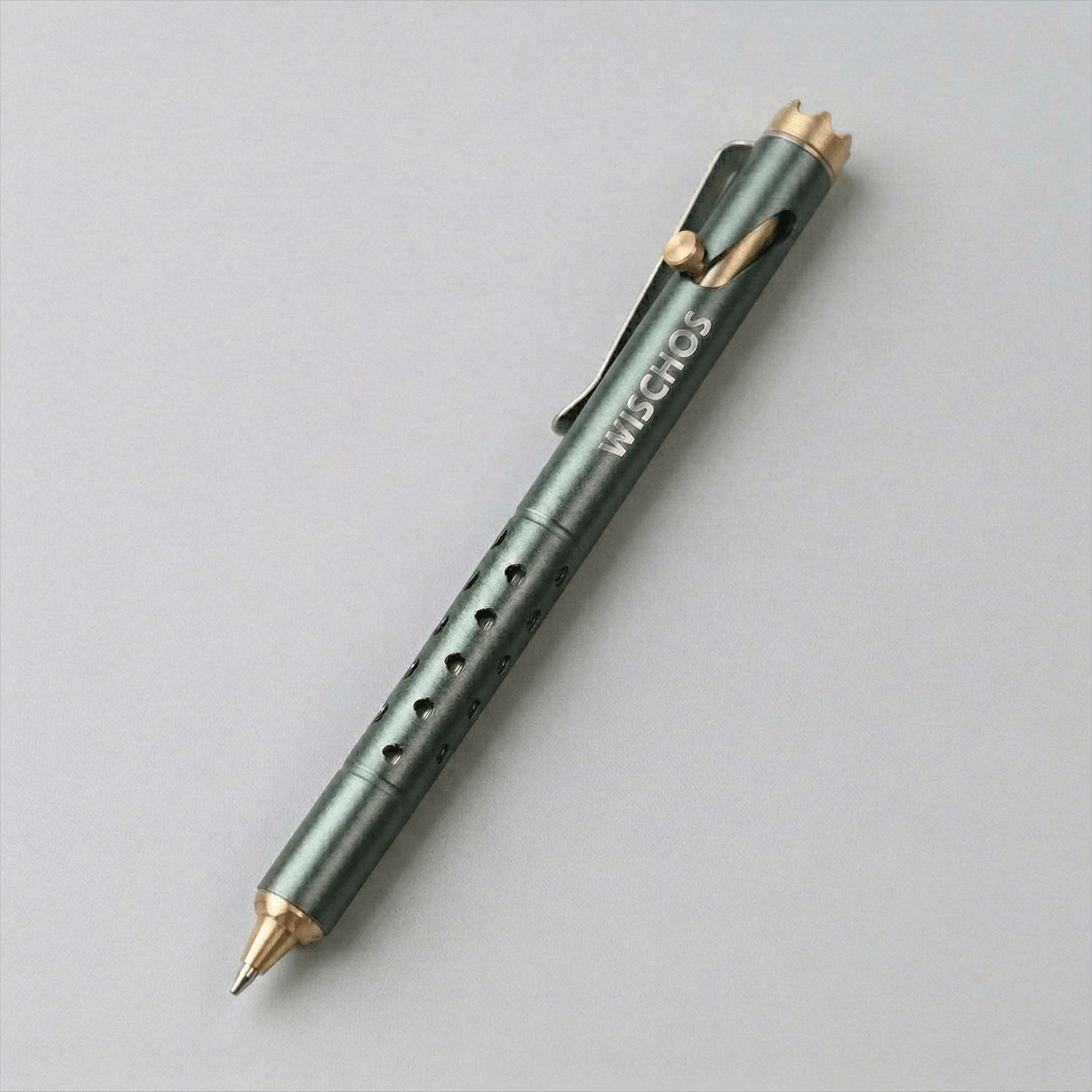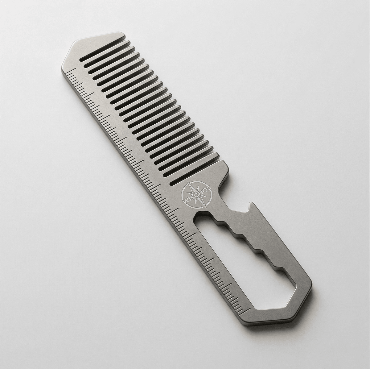 One flask, one comb, one pen — the complete pocket load-out for the professional morning. Shirt-pocket sized flask in pure titanium, precision comb that doubles as a multi-tool, brass pen with a mechanism worth using. The material pairing — titanium and brass — is intentional and cohesive.